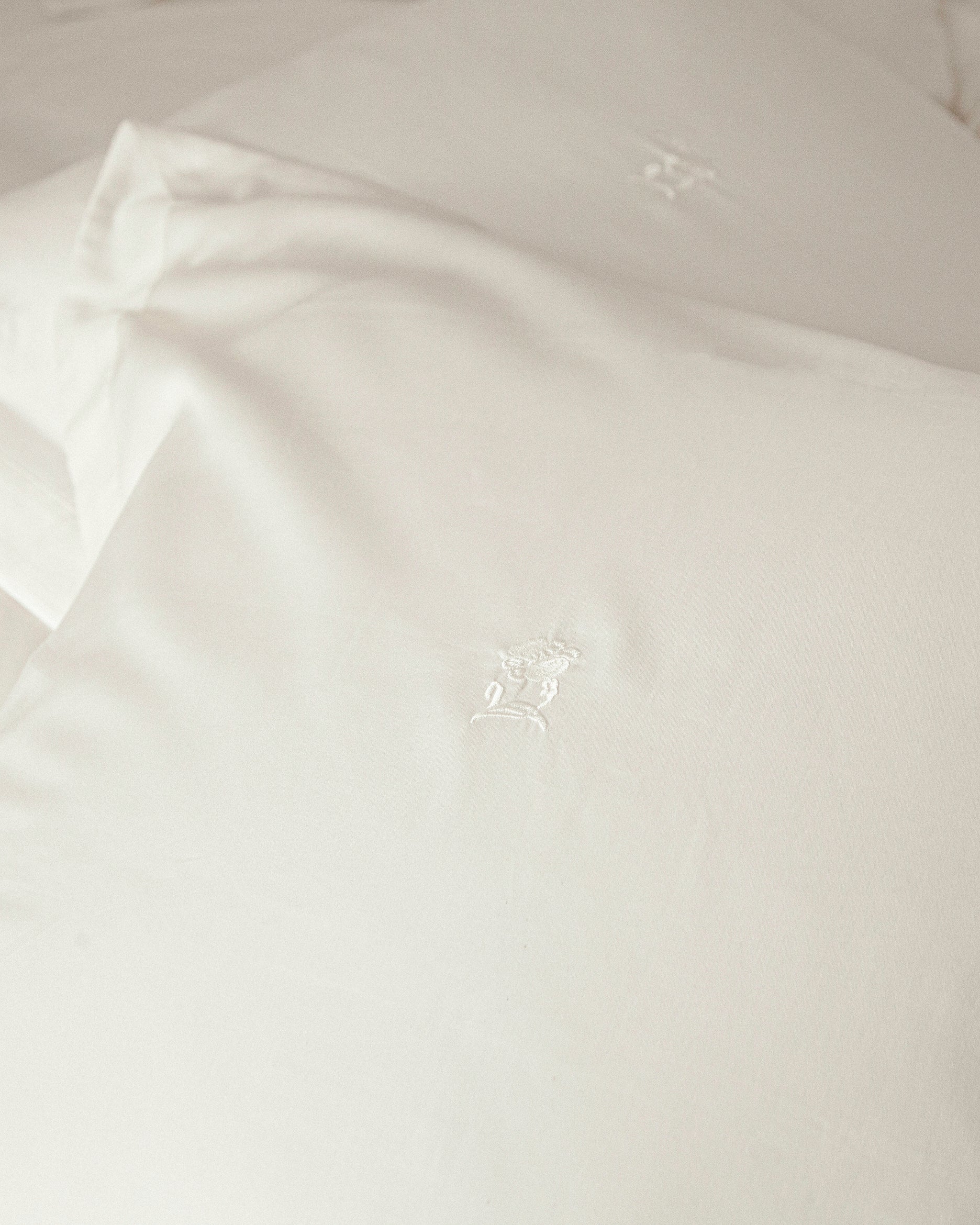 Fountain Blossom takes its inspiration from the hand-painted floral motifs from well-preserved 18th-century pattern illustrations. In this refined variation, the composition is reduced to a single, tone-on-tone embroidery placed gently at the center of the pillow.