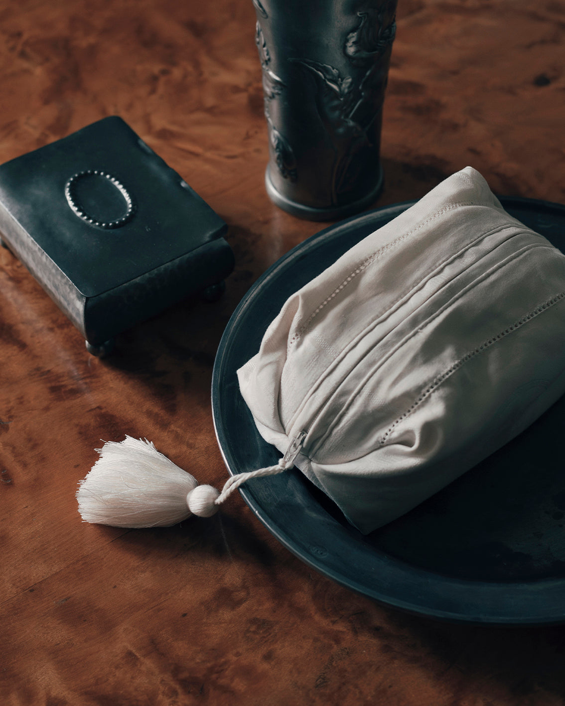 Softly folded with delicate piping and hemstitch detailing, and adorned with a handmade tassel. The Pouch is opened with a discreet zipper and lined with our damask-woven fabric. Available in two sizes, Petite and Grand.