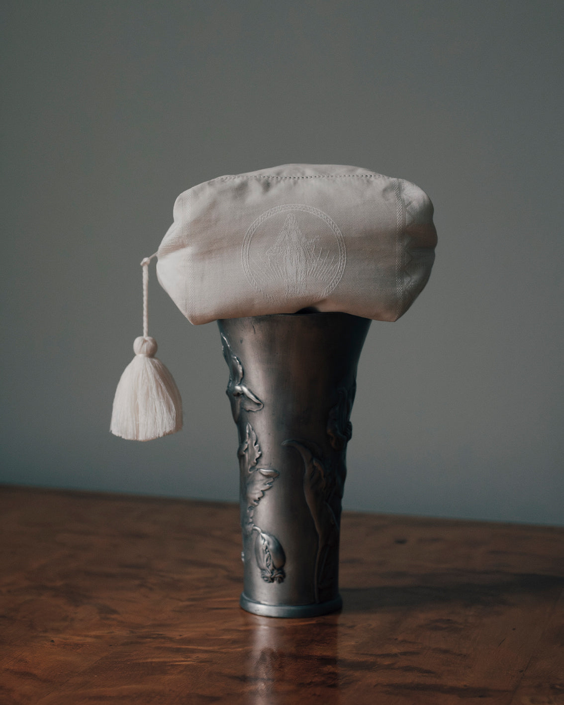 Softly folded with delicate piping and hemstitch detailing, and adorned with a handmade tassel. The Pouch is opened with a discreet zipper and lined with our damask-woven fabric. Available in two sizes, Petite and Grand.